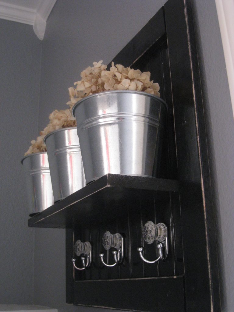 I attached it to the wall, added the metal buckets (purchased at Ikea for $1 each) and filled them with dried hydrangea.